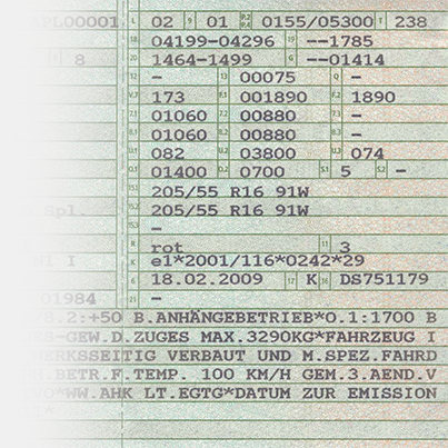 Si solo hay una verificación de resistencia (incluye propiedades mecánicas y verificación de carga de la rueda), estas aplicaciones no están aprobadas en el área de la StVZO. Después de montar las piezas, se debe realizar inmediatamente una certificación única de acuerdo con § 21 StVZO por una organización de inspección oficialmente reconocida. Estas organizaciones de inspección incluyen, por ejemplo, TÜV y DEKRA. Si la certificación única es positiva, los inspectores emiten un documento correspondiente, después del cual es necesaria una corrección inmediata en los documentos del vehículo por parte de la oficina de registro. Recomendamos discutir las modificaciones con el inspector de antemano.